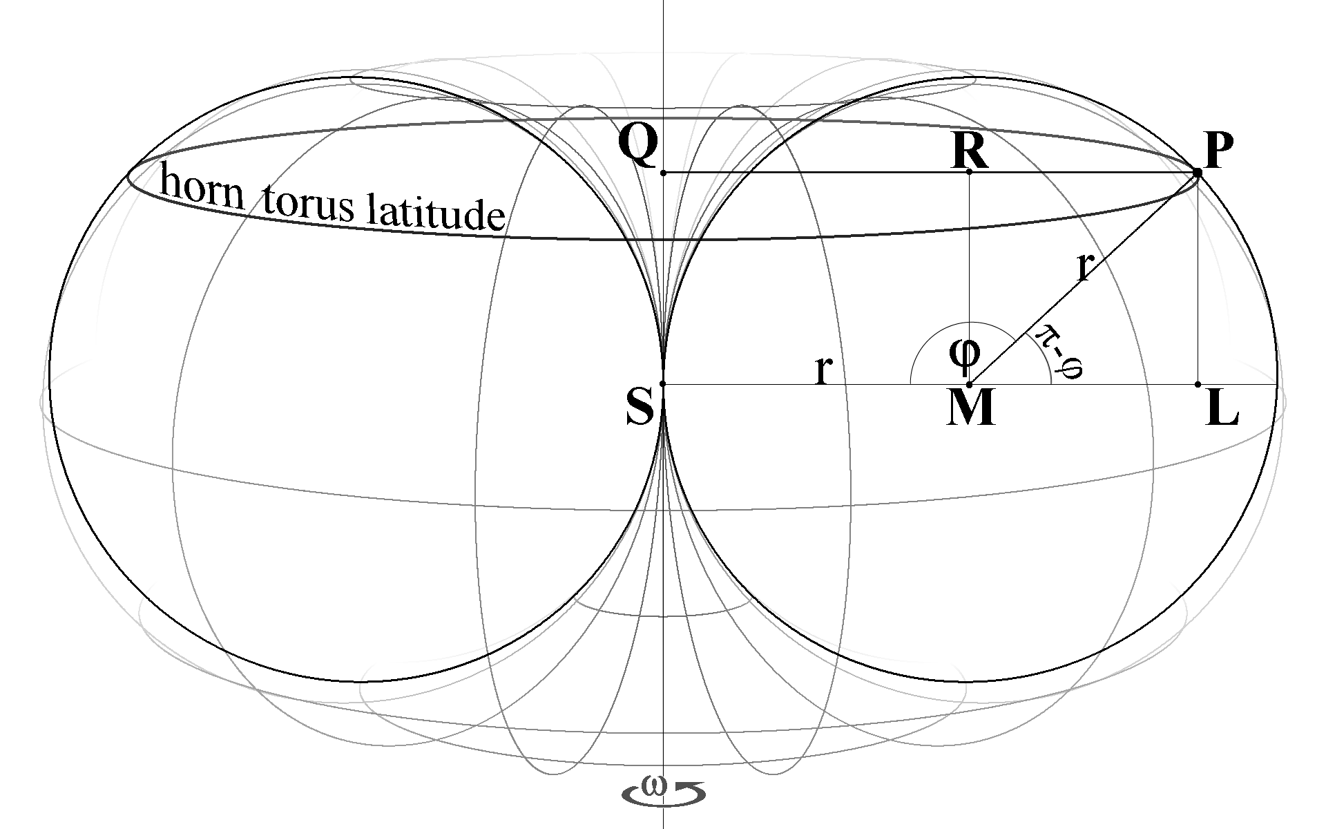 conformal mapping sphere ↔ horn torusDue to the hope that a geometrical solution for the conformal mapping between sphere and horn torus could be found, analogue to the Riemannian stereographic projection, it first seemed necessary to nest horn torus and sphere into one another, resulting in a bit confusing drawings and derivation. But until now the search came to no result (Vyacheslav Puha's ingenious method unfortunately is not conformal, and probably no geometrical method does exist), and so we study sphere and horn torus separately. We don't declare any appropriate stereographic projection and try to proof afterwards the conformality but we use instead the conditions of conformality to compile and establish the wanted mapping analytically:One condition for conformal mapping is that small circles on the origin are mapped as small circles on the target surface and therefore we want to construct small circles on both surfaces that only are dependent on the position of points P on the surface, i. e. only dependent on the angles α = ∠NMP for the sphere resp. φ = ∠SMP for the horn torus. Due to rotation symmetry of both figures the rotation angle ω doesn't play any role and is arbitrary, and likewise, because of mirror symmetry, α can be exchanged by π - α (what corresponds to the exchange of north and south pole of the sphere) and φ can be exchanged by 2π - φ. Even the radii r of both figures turn out to be arbitrary and independent. Following drawing shows longitudes, spacing 10°, and latitudes, spacing 20°, P located at angles α = 50° resp. φ = 140°, ω = 35° on both figures: